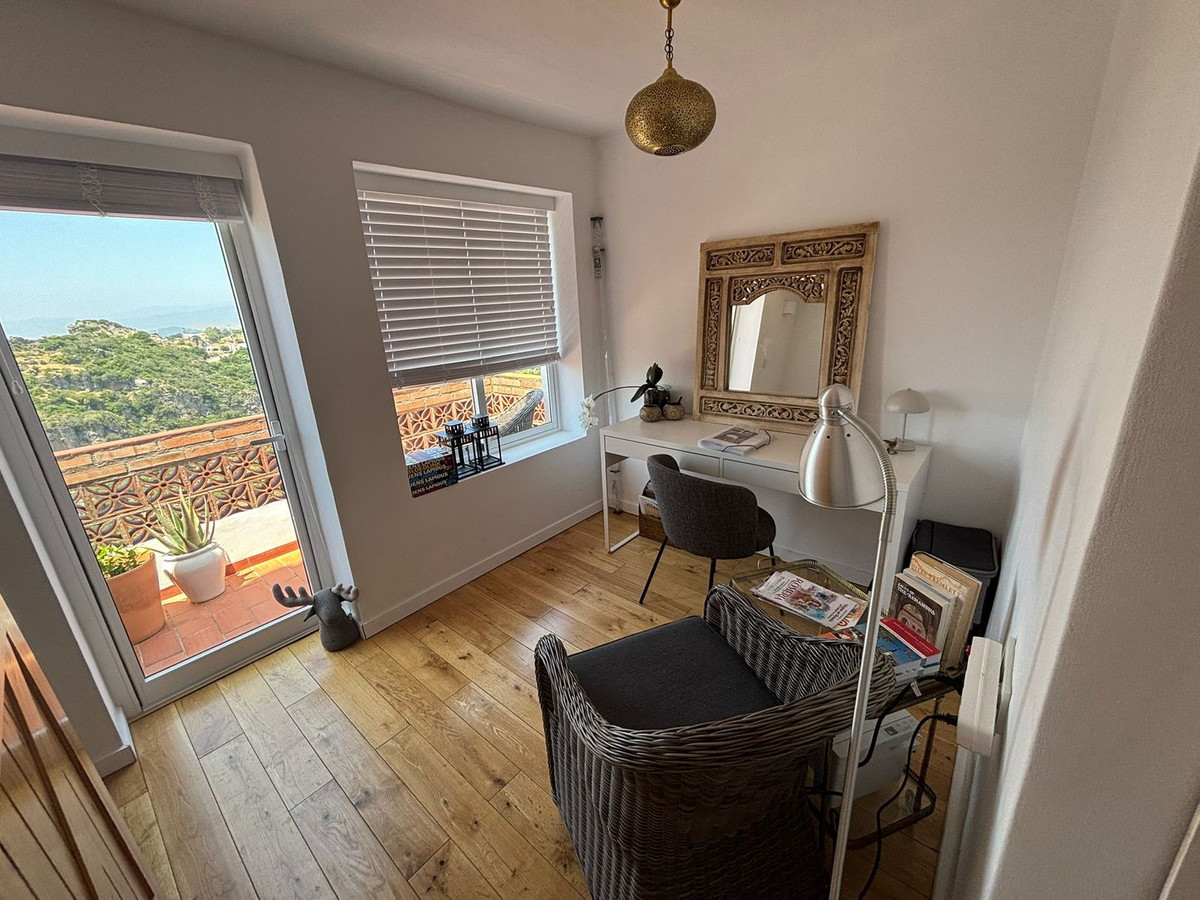Verdeeld over meerdere verdiepingen combineert dit huis de ziel van de Andalusische architectuur met alle moderne gemakken: • Bij de entree verwelkomt een gezellige woonkamer u met warme details en een ontspannen sfeer. • Een niveau lager bevindt zich de hoofdslaapkamer met een en-suite badkamer en een inloopkast. • Vanuit de woonkamer komt u in een volledig uitgeruste keuken met een ontbijthoek en uitzicht op de bergen en de pittoreske Calle. • Op de volgende verdieping bevindt zich de tweede slaapkamer, eveneens met een en-suite badkamer en een eigen balkon met een prachtig uitzicht op het kasteel, de bergen, het dorp en de zee. • En helemaal bovenaan is het dakterras een magische plek met een wasruimte en een 360º panoramisch uitzicht: Sierra Crestellina, het kasteel, de zee en de prachtige natuur rondom dit witgekalkte dorp.