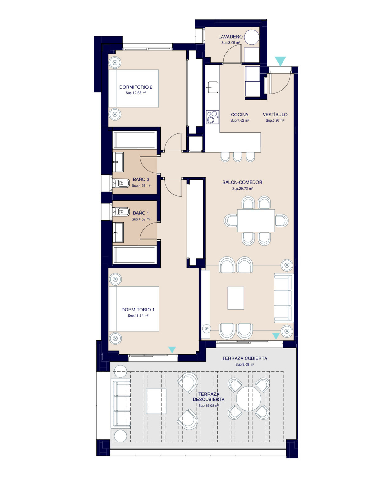 De woning beschikt over 2 slaapkamers en 2 badkamers, een lichte woon-/eetkamer met grote ramen en een volledig ingerichte designkeuken met hoogwaardige apparatuur. De indeling is ontworpen om ruimte, functionaliteit en maximaal natuurlijk licht te bieden, met directe toegang tot een privéterras, ideaal om van het buitenleven te genieten.