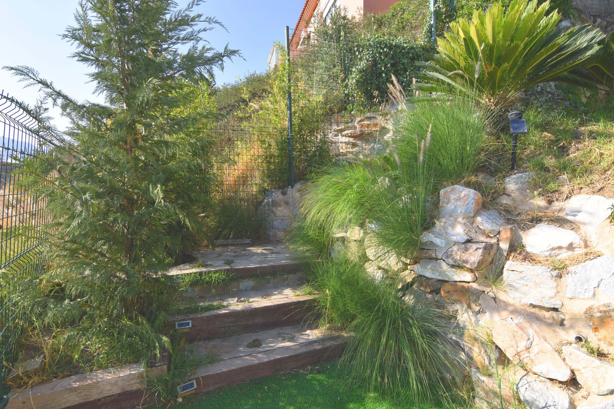 We access the house where there is a closed garage as well as an outdoor parking space; Next to the entrance hall we find a very functional wardrobe area and on the other side access to a patio with a barbecue area. The ground floor includes the living room with views of the mountains, lots of natural light, the office, the spacious and bright kitchen with its terrace and a guest toilet. On the lower floor we have 3 bedrooms and 2 bathrooms, one of them en-suite inside the large master bedroom, all bedrooms have independent air conditioning, fitted wardrobes and direct access to the garden where there is a private pool with an outdoor shower. From there there is access to a guest suite, recently built into the rock and which has a large main room with bathroom and a back room where a kitchen could easily be installed. The suite has a private terrace and offers complete privacy from the rest of the house. From the garden there is a staircase that communicates with the entrance of the house. This house is ready to move into, located in a very exclusive residential area that has its own private security and where there is a 5-star Hilton Hotel, Cafeteria, Restaurants, supermarket, pharmacy, SPA, gym, hairdresser, 2 swimming pools, tennis courts tennis and paddle etc... Contact us for more information.