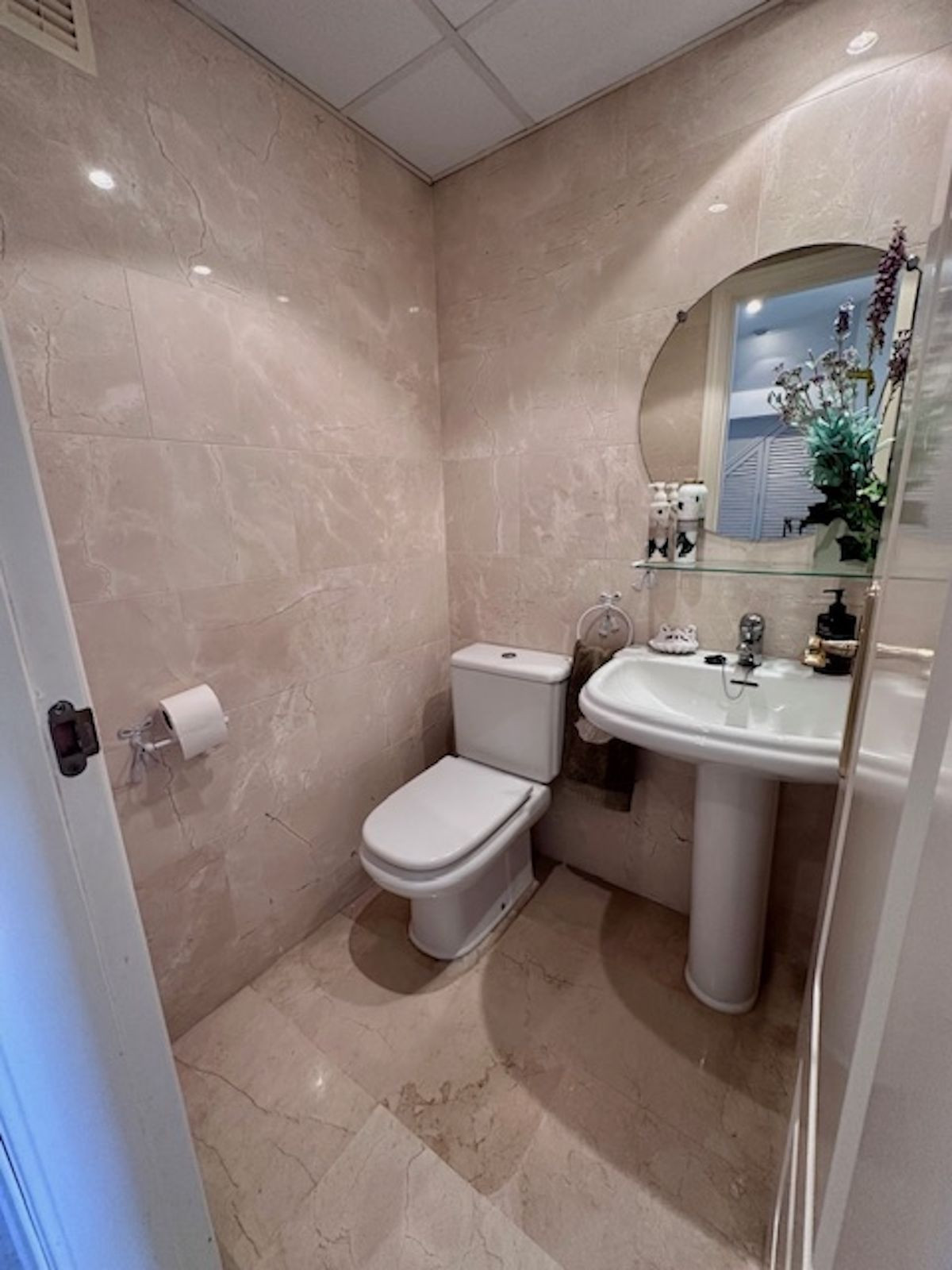 The living room has a guest bathroom and plenty of storage space, as all the stairwells have been closed off with wardrobes, maximizing the space.